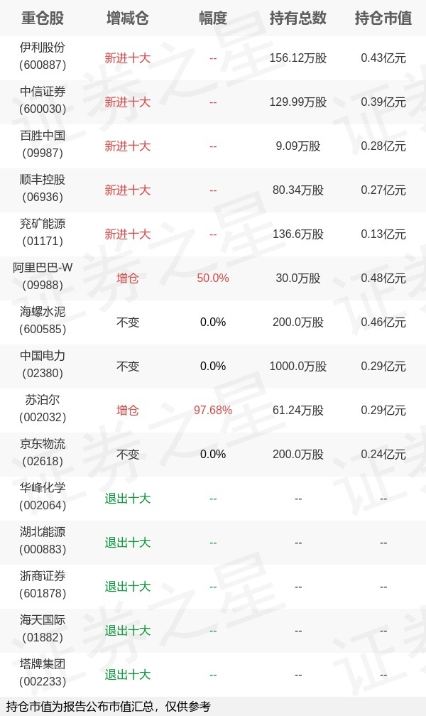 证券之星消息,10月28日嘉实基金旗下赵国英 董福焱管理的嘉实致安3个月定期开放债券型发起式基金公布三季报,近1年净值增长率3.71%。与上一季度相比,该基金前十大重仓股新增伊利股份,中信证券,百胜中国,顺丰控股,兖矿能源;并对阿里巴巴-W增仓10.0万股,为该基金第一大重仓股;华峰化学,湖北能源,浙商证券,海天国际,塔牌集团等退出前十大重仓股;详细数据如下: