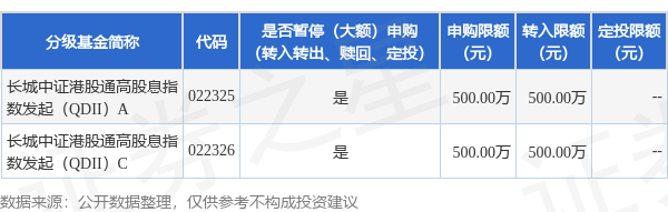 证券之星消息,11月18日长城基金管理有限公司发布《长城中证港股通高股息投资指数型发起式证券投资基金(QDII)暂停大额申购、转换转入、定期定额投资业务的公告》。公告中提示,为保证基金的稳定运作,保护基金份额持有人利益,自2025年11月19日起长城中证港股通高股息投资指数型发起式证券投资基金(QDII)暂停大额申购、转换转入、定期定额投资业务,下属分级基金调整明细如下: