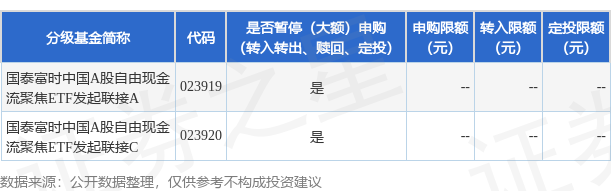 证券之星消息,9月23日国泰基金管理有限公司发布《关于国泰富时中国A股自由现金流聚焦交易型开放式指数证券投资基金发起式联接基金暂停大额申购、定期定额投资及转换转入业务的公告》。公告中提示,为维护基金份额持有人利益,自2025年9月23日起国泰富时中国A股自由现金流聚焦交易型开放式指数证券投资基金发起式联接基金暂停大额申购、定期定额投资及转换转入业务,申购、转换转入上限金额为1000.0万元,下属分级基金调整明细如下: